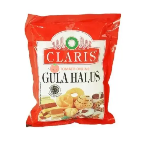 Gula Halus Claris Gula halus dengan warna putih bersih dengan butiran yang sangat lembut. Untuk campuran adonan kue dan untuk menghias kue.