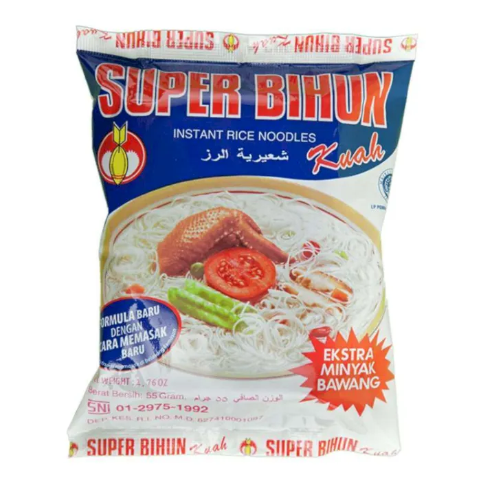 Adalah bihun instan kuah dengan cita rasa ayam. Terbuat dari tepung beras premium dan bahan-bahan pilihan kualitas tinggi yang kemudian melalui proses modern sehingga membuat rasa bihunnya menjadi lezat dan memiliki tekstur bihun yang lembut. Selain itu, bihun instan dari SUPER BIHUN juga telah dilengkapi dengan taburan penyedap rasa dan bubuk cabe yang nikmat membuat rasa dan aromanya semakin gurih. Telah hadir dalam kemasan siap saji yang praktis. Cocok disajikan hangat di pagi hari untuk menu sarapan anda, membuat badan menjadi hangat dan semangat untuk memulai aktifitas. Nikmati kemudahan menikmati bihun premium hanya dengan bihun instan dari SUPER BIHUN Instan Kuah AyamNo reviews found
