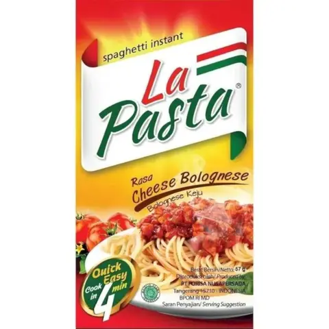 La Pasta merupakan salah satu brand spaghetti yang mungkin banyak disukai oleh masyarakat. Bahkan, La Pasta sangat cocok untuk dinikmati bagi Anda yang ingin memasak pasta secara mudah dalam waktu singkat. Apalagi, tekstur dari La Pasta tidak mudah hancur ketika di masak dan teksturnya sedikit lembut sehingga mudah untuk di cerna. La Pasta juga hadir dengan bumbu bercita rasa khas di dalamnya untuk bisa menghasilkan spaghetti yang lezat di konsumsi. Anda juga bisa menikmati varian rasa lain yaitu La Pasta Spicy Barbeque, La Pasta Cheese Bolognese, La Pasta Royale Cheese Bolognese.