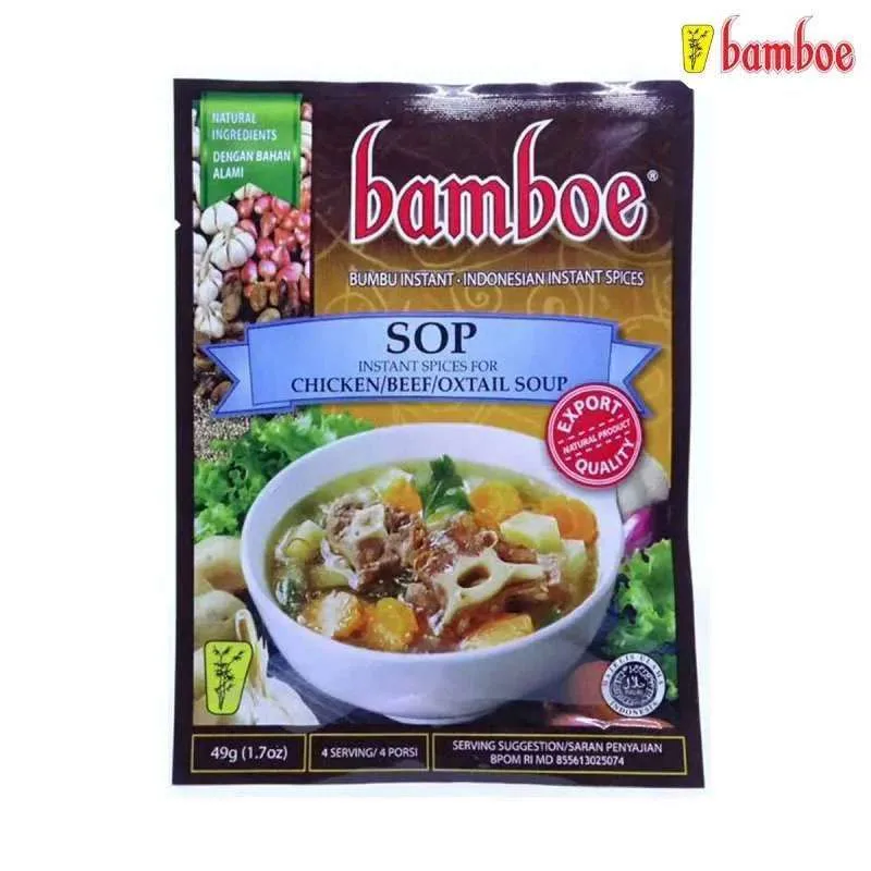 Bamboe Bumbu Sop merupakan bumbu sop instan yang telah dikenal sejak tahun 1968. Diproduksi menggunakan pilihan - natural yang fresh dan berkualitas, tanpa tambahan extract, essence, maupun pewarna buatan. Kini hadir dalam kemasan yang praktis untuk mempermudah anda menyajikan hidangan spesial untuk keluarga.No reviews found