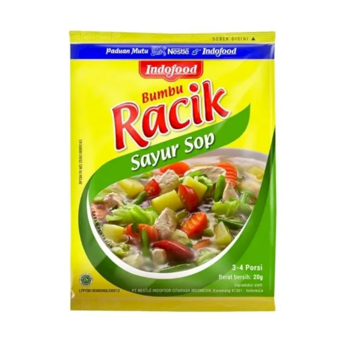 Aneka produk bumbu dapur memang sudah banyak tersedia di pasaran. Sehingga Anda dapat memilih Bumbu Racik Indofood sebagai bumbu dapur keseharian Anda. Racik Bumbu yang diproduksi oleh perusahaan Nestle Indofood Citarasa Indonesia ini merupakan bumbu masak yang sudah merambah di berbagai pasaran. Variasi rasa yang ditawarkan cukup beragam mulai dari Racik Bumbu Sayur Asam, Mie Goreng, Nasi Goreng, Adonan Kremesan / Perkedel, Cah Kangkung, Tumis, Sayur Lodeh dll. Sehingga, Anda dapat memilih Racik Bumbu Indofood sebagai bumbu dapur siap saji untuk keseharian Anda. Masing-masing penggunaannya pun cukup mudah, Anda bisa menggunakan bumbu tersebut tanpa bahan tambahan lainnya. Tak hanya itu, Racik Bumbu juga menyediakan kemasan sachet mulai dari 20 gram, 25 gram, 33 gram, 40 gram, dan 50gram. Bumbu Racik siap saji sendiri merupakan bumbu masak berbentuk bubuk yang terbuat dari bahan rempah-rempah pilihan asli yang sudah dikeringkan tanpa penambahan bahan pengawet atau pewarna. Penggunaanya pun cukup praktis, sehingga Anda tidak perlu mengulek sendiri sekaligus menjaga dapur tetap bersih.