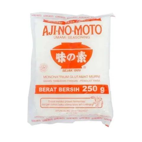 Penyedap rasa Ajinomoto adalah bahan tambahan pangan untuk memperkaya atau memperkuat rasa (gurih/umami) pada masakan Anda, sehingga mendapatkan kelezatan yang diinginkan dengan rasa masakan yang berbeda dari sekedar bumbu biasa. Ajinomoto memiliki tekstur yang halus dan mudah terserap, oleh karena itu sangat cocok untuk beragam hidangan berkuah, aneka tumisan dan lain-lain. Penyedap rasa ini dibuat melalui proses fermentasi dan diracik dari bahan tetes tebu alami, maka dari itu dapat dipastikan Ajinomoto menghasilkan penyedap rasa dengan kualitas terbaik. Bukan hanya itu saja, selain sebagai penyedap rasa gurih pada masakan, bumbu penyedap ini mengandung protein yang dapat memenuhi kebutuhan asam glutamat Anda seperti yang ada pada ikan, udang, daging sapi, ASI dan sayur mayur setiap hari. Ajinomoto sudah memiliki standar internasional dan dibawah lisensi Ajinomoto Co. Inc, sudah terverifikasi Halal.
