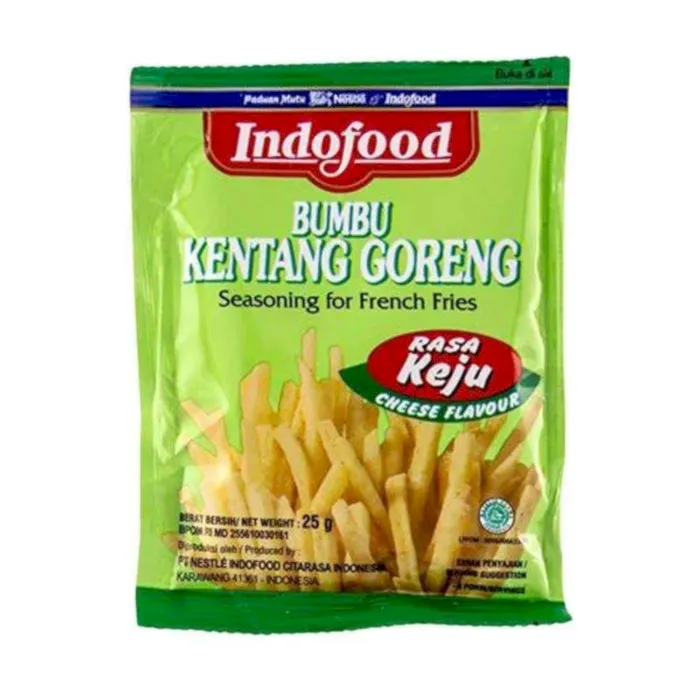 Kentang merupakan salah satu jenis makanan yang dapat menjadi makanan utama maupun camilan disaat Anda sedang senggang. Kandungan pada kentang pun mempunyai khasiat yang baik untuk tubuh Anda. Untuk Anda yang senang menyantap kentang goreng, tambah kelezatan kentang goreng Anda dengan Indofood Bumbu Kentang Goreng Keju. Bumbu instant siap olah dari Indofood ini hadir untuk membantu Anda menghasilkan sajian kentang goreng yang lezat. Bumbu kentang goreng Indofood terbuat dari paduan bahan-bahan pilihan dan diolah secara higienis sehingga menghadirkan bumbu dengan citarasa dan kualitas terjamin yang membuat hidangan kentang goreng Anda lebih spesial.