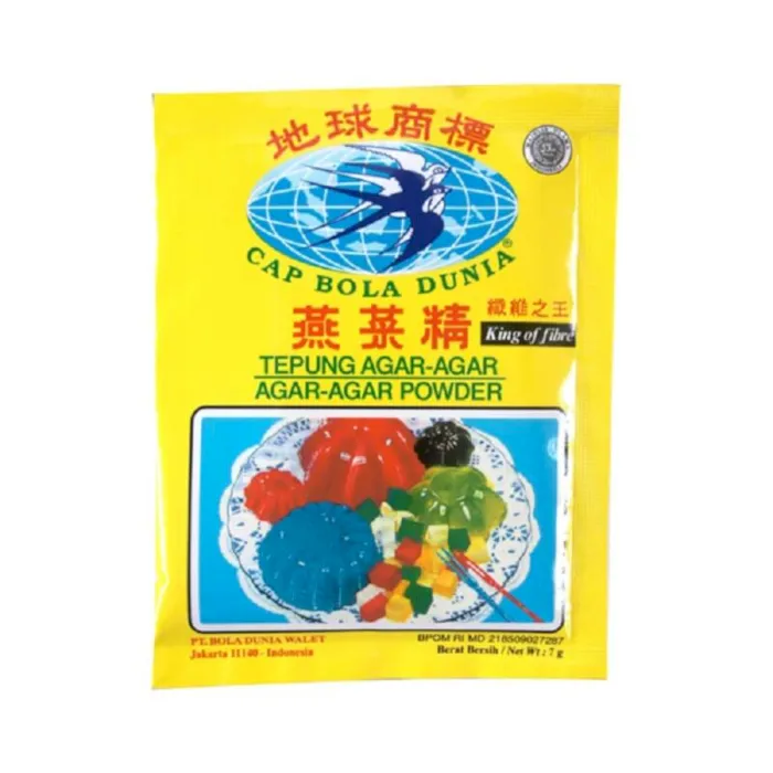 Cap bola dunia agar - agar powder, tepung agar - agar merah berserat tinggi diolah dari sari rumput laut pilihan sebagai santapan yang sehat bagi seluruh keluarga.