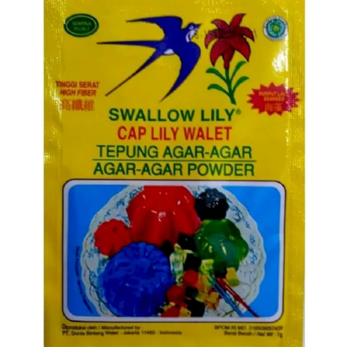 Agar-agar Swallow Lily atau agar-agar cap Lily Walet hadir dalam bentuk bubuk. Agar-agar ini kaya dengan serat yang baik untuk pencernaan, membantu program diet, juga dapat mencegah sembelit dan melancarkan Buang Air Besar (BAB). Makanan ini adalah makanan yang sehat, bebas lemak dan bebas kolestrol. Swallow Lily dapat digunakan untuk membuat puding dengan tekstur lembut. Agar-agar ini memiliki tekstur lembut (Soft Texture) serta medium dry yang berbeda dengan Swallow Globe yang bertekstur kasar dan kering. Swallow Lily tersedia dalam varian warna yaitu, plain (tanpa warna), red, green, brown, orange. Produk ini dikemas dalam ukuran sachet 7 gram.