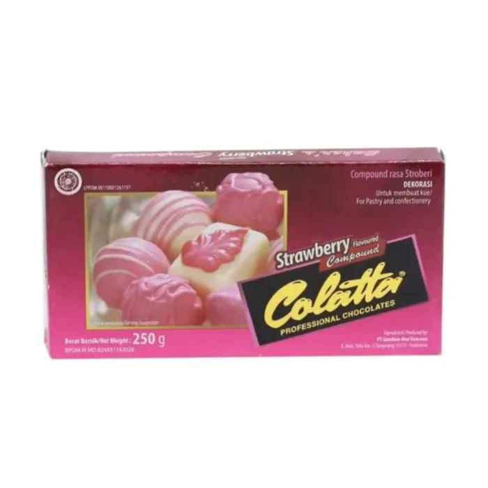 Berkreasi dengan cokelat jadi lebih mudah dengan Colatta Compound Chocolate. Cokelat dengan rasa kuat dan mudah digunakan pada berbagai kreasi resep baik dipanggang, kukus, sebagai lapisan kue, dekorasi maupun isian pada berbagai kreasi seperti chocolate souffle, ganache, sauces chocolate, truffles, dan pembuatan praline. Hasil akhir tetap mengkilap meskipun dipanaskan berulang kali. Colatta Compound Chocolate terdiri dari 4 varian juga dengan ukuran yang lebih besar dari Colatta Compound Dark Duo. Komposisi : Gula, Lemak nabati, Susu bubuk, Kakao bubuk, Pengemulsi : Lesitin kedelai, Perisa stroberi sintetik, Pewarna makanan Erithrosine Cl. 45430 Informasi alergen : Mengandung susu alergen dan kedelai. Diproduksi menggunakan peralatan yang juga mengolah kacang pohon, susu, kedelai, gluten dan telur.