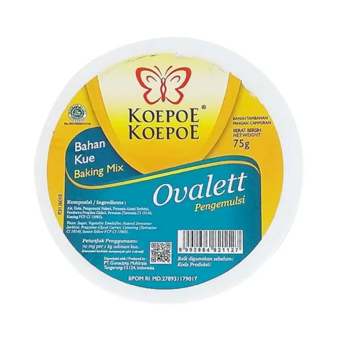 Ovalet adalah cake emulsifier atau pelembut dan penstabil adonan agar adonan cake tidak mudah turun saat dikocok serta membantu adonan tercampur dengan baik. Komposisi kimia ovalet mengandung campuran mono dan digliserida. Biasanyanya ovalet digunakan dalam adonan cake dan juga bolu. Ovalet berwarna kuning dan kental. Perbandingan untuk pemakaiannya adalah 1 sendok teh ovalet untuk 5-6 butir telur. Keunggulan :- Terbuat dari bahan khusus yang berkualitas untuk aneka masakan, kue, roti, maupun biskuit sejak tahun 1942