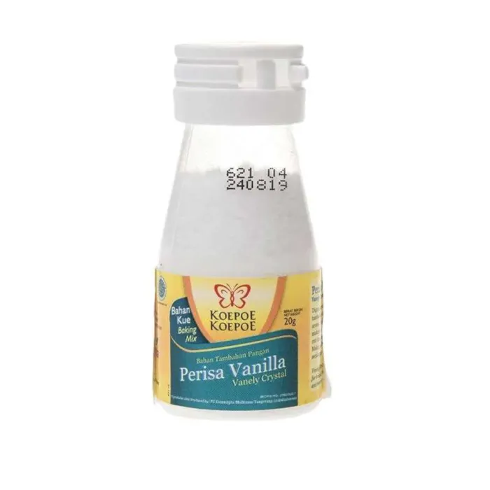 Koepoe Koepoe Perisa Vanilla Berbentuk bubuk putih crystal yang berfungsi sebagai penguat aroma ( essence ) vanilla pada makanan. Dalam hal ini, vanely...
