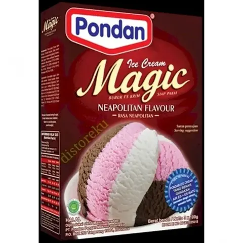 Tepung olahan ice cream rasa cokelat, vanilla, dan strawberry siap pakai (tersedia dalam 1 (satu) kemasan). Pondan menghadirkan magic ice cream,es krim bubuk yg enak dan nikmat rasanya serta mudah sekali penyiapan nya.. anda cukup mencampurkan pondan magic ice cream dgn air es,lalu kocok pada kecepatan tinggi sampai mengental.. Anda dapat juga mengganti air es dgn susu cair dingin utk mendapatkan kualitas es krim.