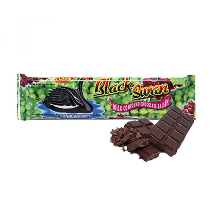 Black Swan merupakan cokelat compound susu isi kacang mete berbentuk batang dan terdiri dari 18 ruas yang mudah dibagi. Dibungkus dengan kemasan menarik yang bergambar angsa hitam ini cocok untuk dihadiahkan untuk orang terkasih. Black Swan juga sangat pas disajikan sebagai camilan saat melalui kesibukan kerja, ketika menikmati liburan bersama keluarga, teman atau bersama orang terkasih serta dapat pula dinikmati di waktu luang kapanpun dan dimanapun. Jika cokelatnya tidak langsung habis, simpanlah di tempat yang jauh dari jangkauan sinar matahari agar tidak mudah meleleh dan berubah rasa.No reviews found