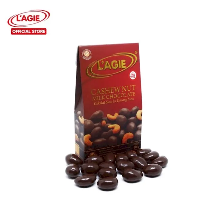L'agie cokelat susu isi kacang mete. Komposisi : Gula, kacang mete, lemak kakao, kakao massa, susu bubuk, whey bubuk, penstabil nabati, pengemulsi lemak kakao, pelapis syelak, pengemulsi amonium fosfatidat, perisa sintetik vanila.