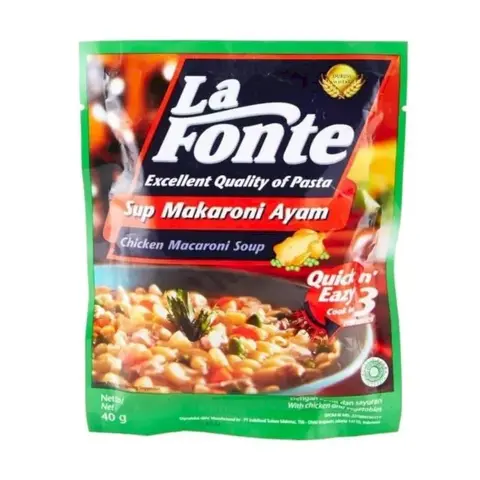 Merupakan sup instan sehat yang dihasilkan dari makaroni, daging, dan sayuran asli sehingga kaya akan nutrisi. Anda dapat menikmati La Fonte Sup Macaroni Ayam ini di sela-sela kesibukan karena penyajiannya yang hanya membutuhkan waktu 3 menit. Bumbu sup yang lezat akan menjadikan La Fonte Sup Macaroni Ayam sebagai salah satu makanan kesukaan Anda. Rasakan kelezatan luar biasa dalam semangkuk La Fonte Sup Macaroni dan jadikan ia teman menjalani aktivitas sehari-hari Anda.No reviews found