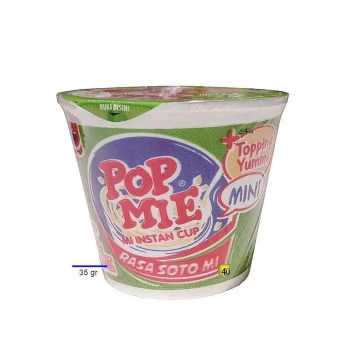 Pop Mie adalah brand dari Indofood berupa mie instan dalam cup siap seduh yg melegenda di Indonesia. Pionir mie instan dalam cup ini begitu merakyat dan tersedia dimana2. Rasanya yg enak dan kepraktisan tinggi yg ditawarkan membuatnya bertahan di top brand mie instan Indonesia. Mempunyai berbagai macam varian rasa dan besar kemasan. Salah satunya adalah Pop Mie Mini 35 gr. Pop Mie dgn kemasan cup kecil, porsi mini yg sangat cocok utk pengganjal perut disela aktifitas sehari2 maupun porsi buat anak yg sangat pas. Tersedia dalam berbagai rasa, beratribut lengkap pula dgn BPOM RI dan Halal MUI. Silahkan diorder utk stok dirumah maupun bekal perjalanan. Varian: 1. Mini Rasa Baso Sapi - mie instan cup dgn rasa Baso Sapi yg gurih. 2. Mini Rasa Ayam Bawang - mie instan rasa ayam dgn minyak bawang yg lezat. 3. Mini Rasa Soto Mi - mie instan rasa soto mi yg ringan dan khasNo reviews found