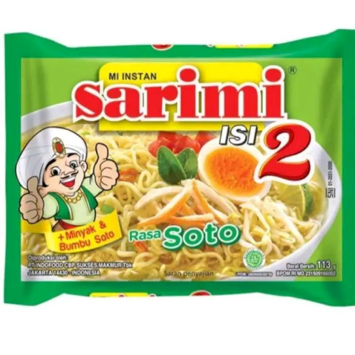 Sarimi Isi 2 merupakan produk mi instan dengan isi 2 keping mie, sudah terdaftar di Badan POM. Sarimi menghadirkan mi kenyal dengan porsi isi dua untuk memuaskan rasa lapar Anda. Sarimi kuah rasa Baso Sapi tersaji dengan bumbu yang gurih enak dan harga yang terjangkau Cara Penyajian :- Rebus mi dan bahan pelengkap dalam 500cc (2 1/2 gelas) air mendidih selama 3 menit, sambil diaduk.