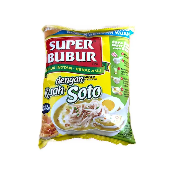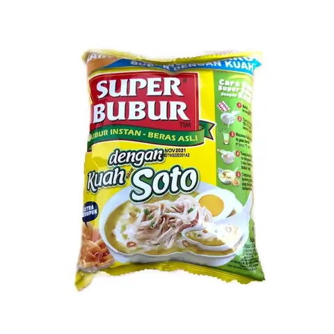 Merupakan makanan pengganti sarapan pagi dan sebagai pengganjal perut yang paling pas saat rasa lapar melanda. Dilengkapi dengan bahan-bahan pelengkap menyempurnakan rasanya yang nikmat. Bubur instan ini cocok dikonsumsi di berbagai suasana. Kemasan yang Praktis Hadir dalam bentuk kemasan, Super Bubur membuat pagi Anda menjadi lebih mudah karena cara penyajiannya yang mudah.No reviews found