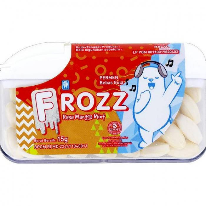 Adalah permen mint yg sudah lama di Indonesia, sekira era 1980an mulai merambah pasar nasional dibawah divisi NIMM'S, satu divisi candy dari perusahaan nasional yg bergerak di bidang obat2an dan laboratium. Produksi PT. KONIMEX - Sukoharjo, permen Frozz ini berevolusi menjadi seperti sekarang. Produk permen mint bebas gula yg enak. Dikemas praktis, teman saku yg baik dan pendamping segala suasana aktifitas anda. Terdiri dari berbagai varian rasa yg unik. Silahkan di order, satu kemasan ber-netto 15 gr, dgn atribut lengkap BPOM RI dan Halal BPOM RI.