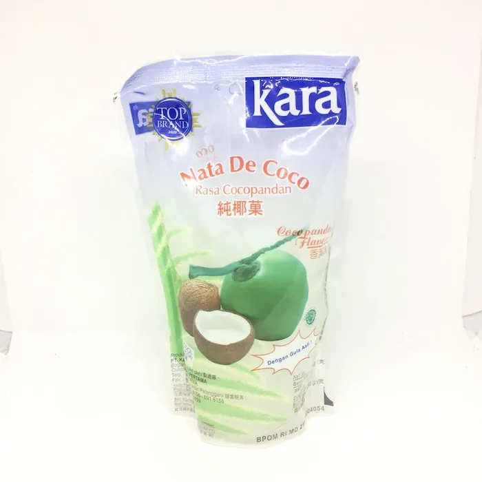 Berupa olahan fermentasi air kelapa yg dibentuk menjadi padat/gel dan dipotong kecil2. Cerita dikit, produk NDC ini terbentuk dari air sebagian besarnya, sari/air kelapa, dan gula murni sebagai substrat pembentuknya. Sangat aman dan baik buat tubuh, terutama baik buat pencernaan terutama untuk mikroflora di usus besar, menurunkan kolesterol, menstabilkan glukosa darah, mencegah obesitas dgn penggunaan gula yg terkontrol tentu saja. Amazing..bagaimana bahan sederhana dari alam sangat berperan penting utk kesehatan kita. Adalah Kara Nata de Coco Plain rasa Cocopandan, produksi PT. Kara Santan Pertama - Bogor, perusahaan yg terkenal dgn produk2 pengolahan kelapa di Indonesia. Dan tentu saja NDC adalah salah satu jenis lini produk yg dihasilkan. Kara Nata de Coco Plain Cocopandan ini adalah NDC yg berpotongan dadu pada umumnya dan terendam dalam larutan sirup tipis dgn rasa cocopandan yg khas dan enak. Bisa langsung di konsumsi tanpa campuran apapun dgn saji dingin lebih nikmat. Pengalaman Mimin: 3/4 gelas NDC Cocopandan ini + air sedikit dan es secukupnya + 1/4 jeruk lemon peras. Nikmat! Berpotongan dadu yg lebih puas digigit karena besar2 dan terasa kenyal. Juga bisa buat campuran minuman seperti es sirup, es buah, es campur, bahkan puding, dll. Dijual menggunakan standing pouch plastik tebal dgn netto 360 gr dalam larutan gula