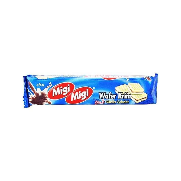 Merupakan wafer renyah dan krim lembut yang lezat. Wafer ini hadir dalam berbagai rasa seperti cokelat, vanilla, strawberry, dan rasa-rasa lain yang menarik. Migi Migi Wafer Krim cocok untuk segala kesempatan, dari santai di rumah hingga piknik keluarga.