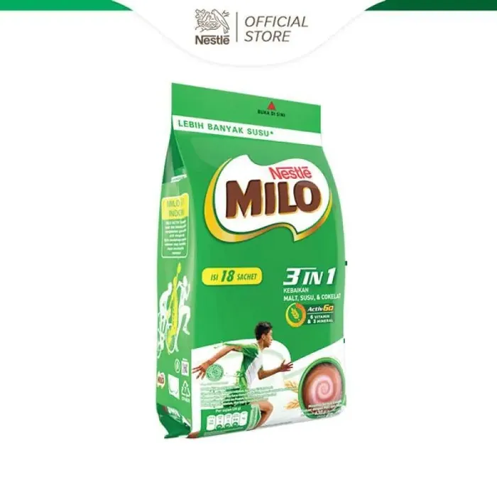 Minuman serbuk cokelat paduan, ekstrak malt (*Barli) yang unik dan juga susu. - Lebih tinggi zat besi, Vitamin B12, C, dan D untuk mencegah defisiensi zat besi dan mendukung performa anak aktif. MILO 3in1 33% lebih rendah gula tambahan/ sukrosa dari produk MILO sebelumnya per sajian 35g (9g 6g). Sehingga, kadar gula dalam MILO lebih sesuai anjuran untuk anak. Meskipun Gula Lebih Rendah, kandungan malt dan cocoa yang lebih tinggi membantu meningkatkan rasa khas MILO yang disukai anak Lebih tinggi Malt. Malt merupakan biji-bijian dari serealia utuh yang dikeringkan, mengandung karbohidrat kompleks untuk dukung energi anak sepanjang hari. Saran penyimpanan: simpan di suhu ruangan SARAN PENYAJIAN (HANGAT ATAU DINGIN) -Tuangkan 4 sendok makan penuh MILO (35g) -Larutkan dengan air hangat (175 ml), aduk hingga rata -Tambahkan es batu untuk penyajian dingin KOMPOSISI: Padatan *Susu (*Susu Bubuk Skim, *Susu Bubuk), Ekstrak Malt (*Barli), Gula, Bubuk Kakao, Serat Pangan, Minyak Nabati, 4 Mineral, Premiks Vitamin, Pemanis Alami Glikosida Steviol. *Mengandung allergenNo reviews found