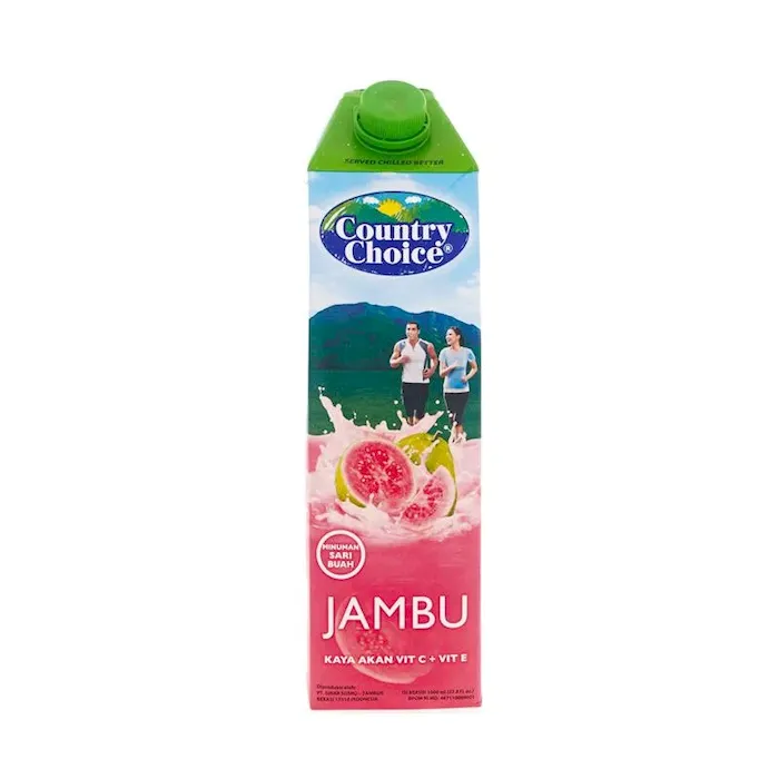 Kemanapun kamu pergi Country Choice selalu siap membuatmu tetap fresh sepanjang hari. Dengan kesegaran buah pilihan, Country Choice siap menemani hari-hari kamu dimana saja dan kapan saja. Hadir dengan berbagai rasa buah alami yang Yummy dan berkualitas yaitu Jeruk, Jambu, Mangga dan Apel membuat Country Choice cocok dijadikan pilihan tepat untuk dinikmati bersama teman dan keluarga. Selain itu, minuman Real Jus ini juga juga kaya akan manfaat yang dapat memenuhi kebutuhan nutrisi harian dengan cara yang praktis dan hemat, sehingga kamu bisa kembali bersemangat menjalani aktivitas. Terdiri dari kemasan kotak (Tetra Pak) dengan ukuran 250ml dan 1L. Note: Kemasan Dapat Berubah Sewaktu-waktu Tanpa Pemberitahuan Country Choice Guava merupakan varian minuman jus buah dari Country Choice yang terbuat dari buah jambu pilihan. Kaya akan kandungan Vitamin C dan Vitamin E yang berperan sebagai antioksidan yang baik bagi tubuh. Diproses secara higienis dan dikemas dalam kemasan tetrapak yang kedap udara dan cahaya sehingga jus buah terlindung dari pengaruh suhu dan sinar matahari. Juga memudahkan untuk dibawa dan dikonsumsi kapan dan di mana saja. Minuman jus buah Country Choice Guava yang kaya manfaat ini baik untuk dikonsumsi secara teratur. Rasanya yang alami memberikan sensasi minum jus nikmat serasa jus buatan di rumah.