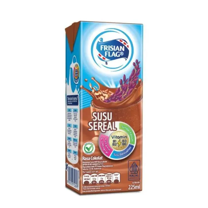 Frisian Flag Susu Seral merupakan susu cair on-the-go yang diformulasikan khusus untuk memenuhi kebutuhan nutrisi sehari-hari. Susu ini dibuat melalui proses UHT atau Ultra High Temperature dengan cara memanaskan susu segar yang baru diperas pada suhu 135 hingga 150 derajat Celsius dengan kurun waktu sekitar 2-3 detik. Proses pemanasan ini bertujuan untuk membunuh bakteri jahat dan juga menjaga nutrisi yang terdapat didalam susu. Frisian Flag Susu Sereal hadir dengan varian rasa Cokelat yang mamadukan segarnya susu dan lezatnya sereal cokelat guna menciptakan rasa yang unik dan nikmat. Lalu, Frisian Flag Susu Sereal tentunya dilengkapi dengan beragam nutrisi baik yang dibutuhkan oleh tubuh, seperti Vitamin A, Vitamin D3, Vitamin B1, Vitamin B2, Vitamin B3, Vitamin B6, Vitamin B12, Kalsium, Fosfor, dan Iodium. Kandungan Vitamin B Kompleks yang ada di susu ini digunakan sebagai penambah energi dengan tambahan sereal Oat, Brown Rice dan Riceberry. Menariknya, rutin mengonsumsi susu cair UHT ternyata juga membawa dampak yang baik bagi kesehatan tubuh, seperti memenuhi kebutuhan nutrisi, membantu proses pertumbuhan tulang, meningkatkan sistem kekebalan tubuh, mendukung kerja sistem saraf, serta menjadi salah sumber energi sehari-hari. Oleh karena itu, jadikan tubuh semakin sehat dan penuhi kebutuhan nutrisi harian dengan minum Frisian Flag Susu Sereal Cokelat.