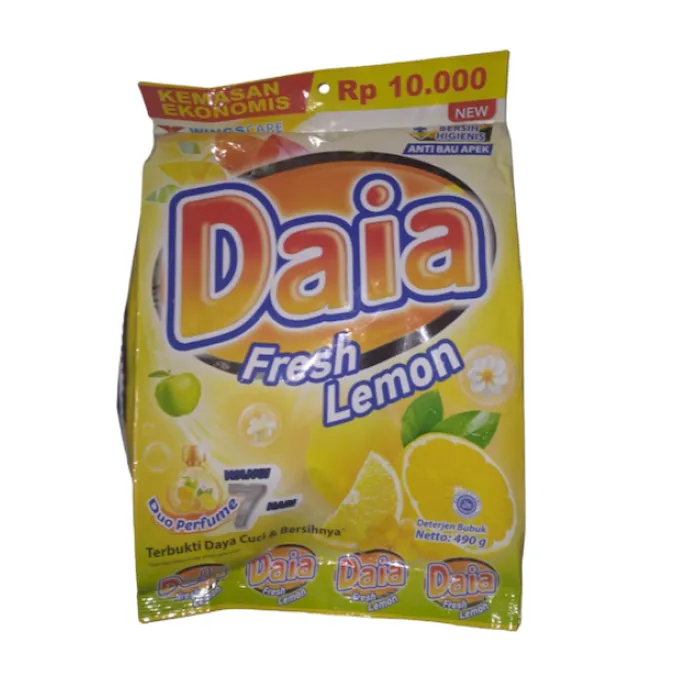 Detergen DAIA membuat warna pakaian semakin cerah dan cemerlang. Dilengkapi dengan 6 keunggulan yang mampu membersihkan pakaian secara all out, dan menjaga warna tetap stand out. Daia Deterjen, Deterjen Bubuk No 1 di Indonesia (2019, Nielsen) 6 Keunggulan : - Mampu membersihkan pakaian secara all out - Busa melimpah - Teknologi White Booster, membuat warna pakaian semakin cerah dan cemerlang - Lembut ditangan - Wangi tahan lama - Anti apek Cara Mencuci: - Larutkan 1 genggam (+- 28 gr) Daia Deterjen ke dalam 10 L air - Pisahkan pakaian putih, berwarna, dan mudah luntur - Sebaiknya rendam cucian selama 30 menit - Kucek sebentar dan bilas sampai bersihNo reviews found