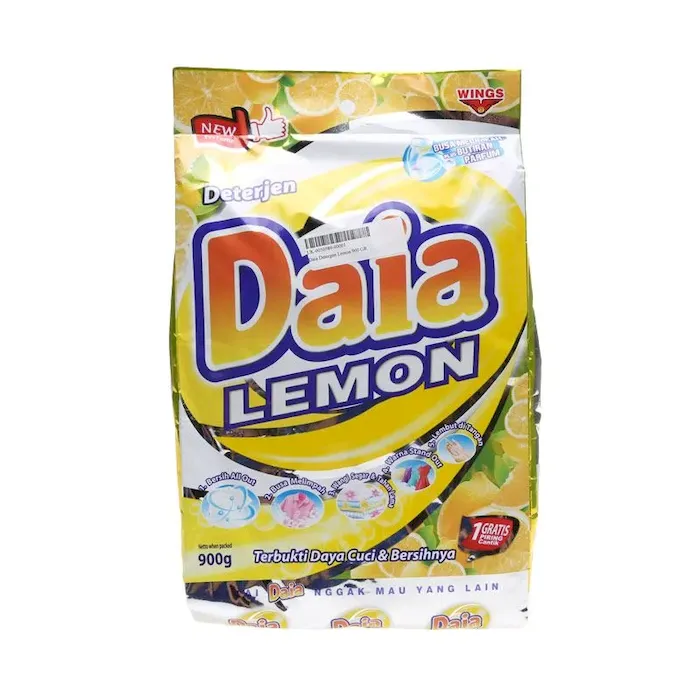 Merupakan deterjen bubuk dengan keharuman aroma lemon segar dan tahan lama yang diformulasikan ampuh untuk membersihkan pakaian dari kotoran serta membunuh kuman yang menempel pada pakaian saat dijemur hingga kering. Detergent daia ini memiliki busa melimpah yang membersihkan pakaian dengan sempurna, ramah lingkungan, serta membuat tangan Anda tetap lembut. Cara mencuci- Larutkan 1 genggam DAIA kedalam +/- 10 liter air