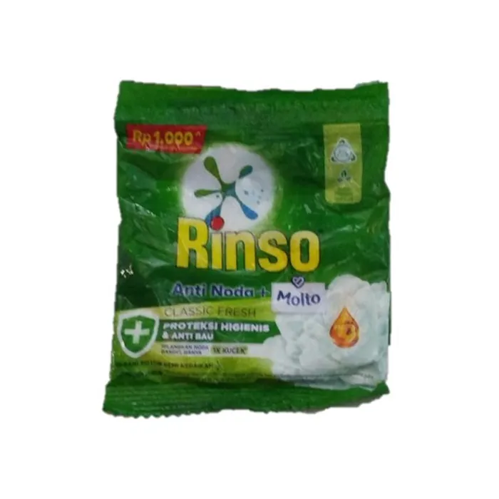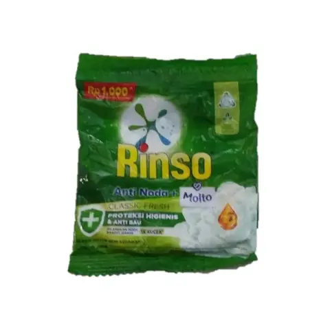 8 Keunggulan 99.99% efekti membunuh bakteri dan virus, Hilangkan bau tak sedap & bau apek pada pakaian, Wangi Molto tahan lama (hingga 21 hari), Hilangkan noda hanya 1x kucek, Lembut & tidak panas di tangan, Mengandung ekstra pelembut, membuat serat kain lembut & halus, Jaga warna pakaian tetap cemerlang, Surfaktan mudah terurai. Langkah mudah mencuci: 1. Pisahkan pakaian putih dan berwarna. 2. Larutkan 1 genggam Rinso Anti Noda + Molto dalam 10 liter air. Pastikan semua bubuk larut. Untuk pakaian yang sangat kotor, takaran dapat ditambah. 3. Sebaiknya rendam pakaian selama 30 menit. 4. Kucek seperlunya hingga bersih. 5. Bilas sampai bersih. Diproduksi oleh : PT Unilever Indonesia Tbk Bekasi - IndonesiaNo reviews found