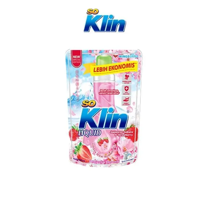 Soklin Liquid Soft Sakura, terinspirasi dari keindahan musim semi di Jepang, So Klin menghadirkan Sakura Collection. Nikmati wangi bunga sakura dengan strawberry yang lembut dan menyegarkan pada pakaian Anda. Diperkaya dengan +softener, mampu mebersihkan sekaligus melembutkan pakaian. Formula Power Clean Action pada Soklin Liquid mampu membersihkan noda secara menyeluruh dan menjaga warna tetap cemerlang tanpa merusak serat kain. Dengan 50% Ekstra Konsentrat cukup 1/2 tutup botol untuk 1x cuci 7 Keunggulan Deterjen Cair Konsentrat 1. Fresh Lock : Mengandung Anti Bakteri*. Tidak bau meskipun direndam lama dan melindungi pakaian dari bau apek 2. Concentrate Formula : Formula lebih efektif dan cepat membersihkan 3. Long Lasting Formula : Wangi Tahan Lama 4. Easy Dissolved Formula : Mudah larut dan meresap, tidak meninggalkan residu pada pakaian 5. Bright Activator : Menjaga warna pakaian tetap cemerlang 6. Mild Formula : Lembut, tidak panas di tangan 7. Eco-Friendly : Mengandung surfaktan ramah lingkungan Cara Mencuci : 1. Pisahkan pakaian putih dan bewarna 2. Larutkan 1/2 tutup So Klin Liquid ke dalam 10L air (untuk 15-25 pakaian) 3. Rendam pakaian selama 30 menit 4. Kucek seperlunya, bilas hingga bersih 5. Dapat dituangkan langsung ke noda membandel lalu kucek 6. Bisa untuk mencuci dengan mesin cuci maupun dengan tangan *Berdasarkan hasil uji laboratorium terhadap bakteri S.aureus dan E.coli