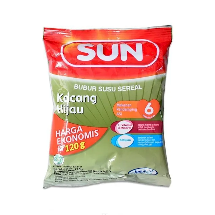 Makanan pendemping ASI bubuk instan untuk bayi dan anak usia 6-24 bulan dengan nutrisi lengkap dan seimbang. Cara Penggunaan : Masukan 6 sendok makan bubur susu sun ke dalam mangkok bersih, tuangkan 1 gelas susu hangat kedalam mangkok, aduk hingga rata hingga siap dihidangkan.