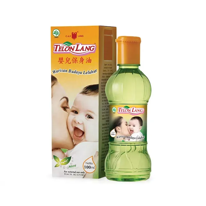 Minyak telon yang diformulasikan dari bahan alami terbaik. Dapat digunakan untuk keperluan bayi seperti menghangatkan tubuhnya saat berpergian atau saat setelah mandi. Indikasi / Manfaat / Kegunaan : Menjaga kehangatan tubuh bayi, meredakan perut kembung, mencegah gigitan nyamuk. Tag telon , minyak telon , cap lang , bayi , penghangat Komposisi Minyak Kayu putih, minyak adas manis, minyak kelapa. Dosis Oleskan minyak telon secukupnya pada dada, perut, dan telapak kaki. Penyajian Dapat digunakan setiap hari, terutama sehabis mandi dan bila udara dingin.No reviews found