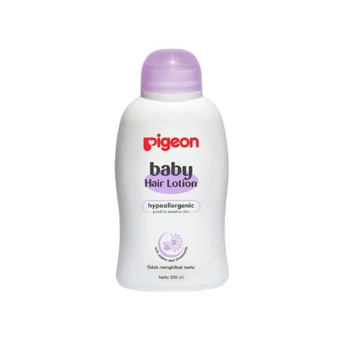 Pigeon Baby Hair Lotion adalah salah satu rangkaian perawatan untuk kulit Si Kecil yang mengandung Jojoba dan Chamomile yang dapat menjaga rambut bayi tetap lembut, sehat bercahaya, harum dan segar. Hair Lotion ini tidak mengandung ethanol (ethyl alcohol) serta diperkaya dengan ekstrak seledri, kemiri dan aloe vera yang bisa membantu rambut bayi tetap sehat, hitam dan bersinar. Menariknya, Lotion untuk rambut dari Pigeon ini sudah teruji secara dermatologi tidak berpotensi menimbulkan alergi, sehingga sesuai digunakan untuk kulit bayi yang sensitif. Tidak hanya itu saja, Pigeon Baby Hair Lotion ini juga tidak mengandung pewarna yang dapat menjadi pemicu alergi pada kulit bayi yang masih sensitif dan sudah tersertifikasi halal dari MUI. Selain itu, untuk pemakaiannya sangat mudah, cukup keramas dan keringkan rambut dengan handuk. Kemudian usapkan Pigeon Baby Hair Lotion pada rambut dan kulit kepala bayi dengan pijatan ringan lalu sisirlah rambut si buah hati. Karena beberapa keunggulan tersebut, jangan lupa selalu sediakan Pigeon Baby Hair Lotion hadir dengan improved formula yang membuat hari-hari sang buah hati semakin ceria.