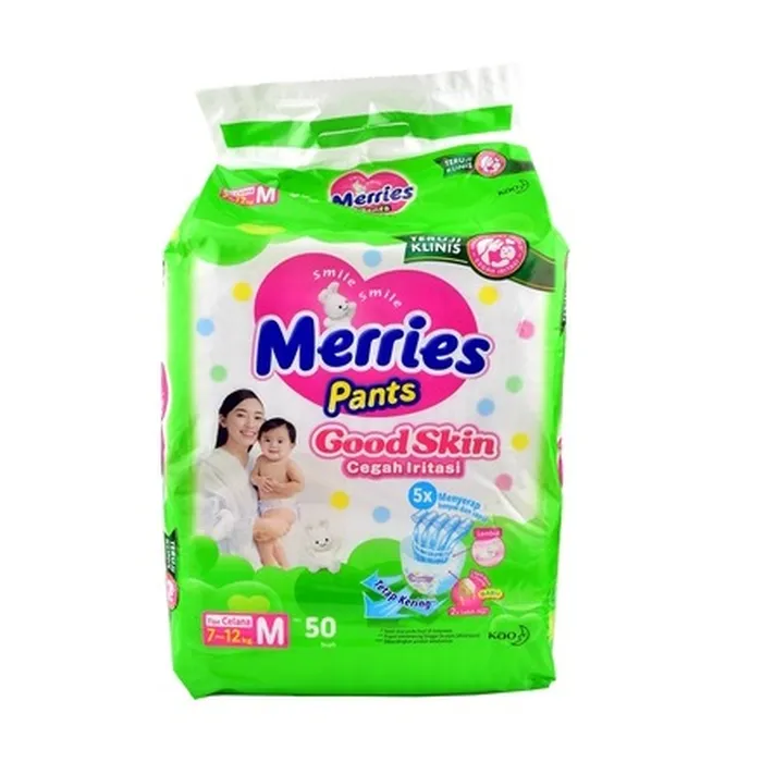 Merries Pants Good Skin Popok Bayi merupakan popok bayi yang dirancang berkualitas tinggi khusus untuk kulit lembut Bayi. Mengingat kulit Bayi memiliki sensitifitas yang berbeda dengan kulit orang dewasa sehingga untuk para Ibu harus lebih selektif dalam pemilihan popok, karena kesalahan dalam pemilihan popok dapat menyebabkan iritasi pada kulit bayi Anda. Merries Pants Good Skin memiliki kualitas bahan dengan Soft Air System berkualitas yang akan menjadikan kulit bayi tetap lembut. Daya tampung popok ini lebih banyak membuatnya tetap kering walaupun pipis berkali-kali sehingga para Ibu tak perlu khawatir akan kebocoran yang sering terjadi. Para Ibu harus mengetahui bahwa penyebab iritasi terjadi pada kulit bayi berasal dari gesekan permukaan popok yang kasar dan kondisi popok yang lembab ketika cairan belum terserap dengan baik. Oleh karena itu Merries Pants Good Skin merupakan solusi yang tepat dengan bahan yang lembut dan daya serap yang cepat untuk menjaga kulit bayi. Tak hanya itu, kebanyakan popok bayi juga cenderung membuat bekas yang dapat menyebabkan iritasi pada karet pinggangnya. Namun Merries Pants Good Skin Popok Bayi hadir dengan permukaan yang lembut dan karet yang elastis sehingga tidak akan menimbulkan bekas pada pinggang bayi meskipun banyak bergerak.Tersedia Dalam Berbagai Ukuran
