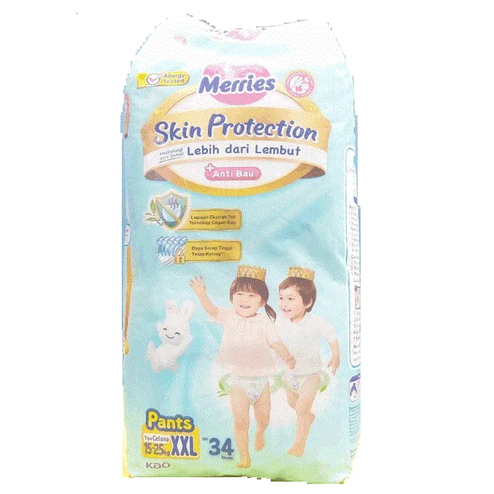 Merries Skin Protection merupakan popok premium multi proteksi dengan lapisan antibakteri yang mengandung ekstrak teh. Merries diproduksi dengan teknologi Jepang menghasilkan Teknologi +Anti Bau mencegah bau popok bahkan setelah terisi. Popok Sekali pakai (atau yang sering disebut pempers atau pempes) Merries Skin Protection sudah Teruji Klinis dan Allergy Tested, Cegah iritasi, ruam, gatal dan alergi pada kulit bayi. Perlindungan ekstra untuk menjaga kulit bayi yang sehat. - Popok Bayi dengan lapisan antibakteri yang mengandung Ekstrak Teh - Lebih dari sekedar lembut, Merries Skin Protection kini hadir dengan teknologi +Anti Bau, cegah bau pipis bahkan setelah terisi. - Memiliki jalur serap, menyerap banyak, cepat dan tidak menggembung. - Dermatology tested teruji klinis cegah iritasi, ruam, dan gatal - Popok Bayi Merries Skin Protection adalah perlengkapan bayi multiproteksi terbaik untuk perlindungan kulit bayi yang sehat. - Kini tersedia ukuran XXL untuk menemani seluruh Langkah pertumbuhan Si Kecil - Popok bayi tipe celana ukuran XXL [15 – 25 kg] Cara Pakai: 1. Bagian depan popok meries bertuliskan “Front/Depan” 2. Pakaikan popok merries seperti celana, lalu tarik hingga menutupi pusar 3. Rapikan bagian sekitar paha agar tidak terlipat ke dalam untuk mencegah kebocoran 4. Ganti popok setiap 3-4 jam sekali atau setiap setelah Si Kecil pup