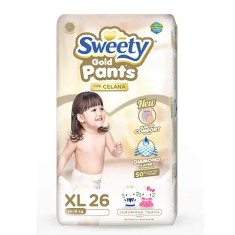 Bebaskan si Kecil bergerak dengan Sweety Gold Pants. Diapers yang satu ini merupakan popok celana untuk bayi yang hadir dengan Adaptive Intelligence Technology yang dapat menyesuaikan dengan bentuk tubuh, Diamond Layer Technology serta 3D Line Flexy-Dry Adapt Core agar dapat menyerap cairan lebih cepat dan mengurangi risiko kulit bayi terkena cairan sehingga menjaga kulit bayi untuk tetap sehat. Sweety Gold Pants ini dirancang khusus dengan FitFlex Technology LYCRA HyFit, Adapt Fit yaitu desain karet lembut diseluruh area popok si Kecil. Selain itu, Sweety Gold Pants juga dilengkapi dengan Disposable Tape yang kuat dan disertai dengan Wetness Indicator untuk menandakan kapan Anda harus mengganti popok si Kecil.Dilengkapi Overnight Pants Maximum Absorbency dan Kandungan Natural Aloe Vera