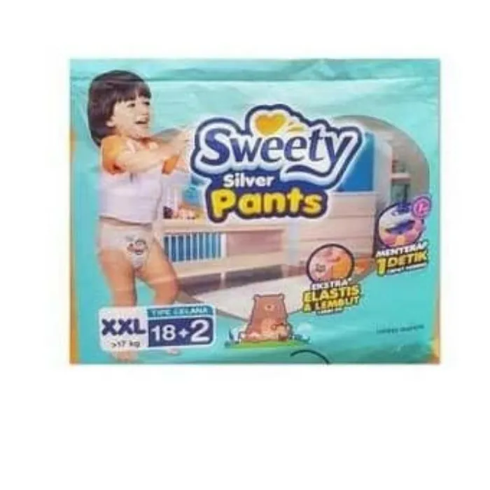 Adalah popok celana untuk bayi yang didesain khusus untuk mampu menyerap dalam satu detik sehingga menyerap cairan dengan cepat dan menjaga permukaan yang bersentuhan dengan kulit bayi tetap kering. Selain itu, dengan karet Elastis serta Ekstra Lembut di pinggang & paha tidak meninggalkan bekas merah atau iritasi. Sweety Silver Pants telah dibuktikan secara klinis oleh Australian Dermatologist, bersertifikat Halal, dan bersertifikat BPA Free, menjadikannya pilihan para ahli ibu dan bayi. Keunggulan: