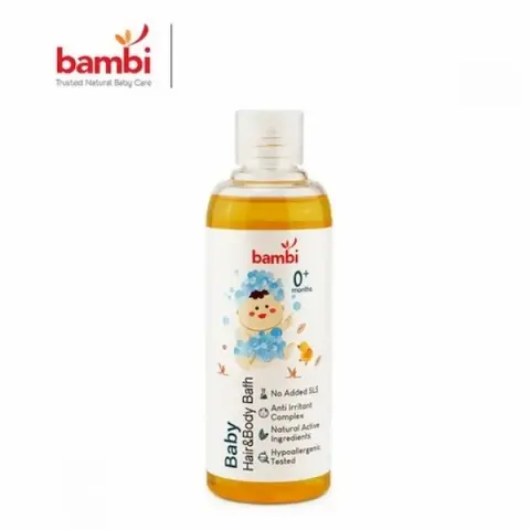 Bambi Hair & Body Bath dapat membersihkan rambut dan kulit tubuh secara lembut, merawat rambut bayi agar tetap lurus dan tidak kusut, tidak menimbulkan iritasi. Bambi Hair & Body Bath mengandung Anti irritant complex, seperti: Pro Vitamin B5, Ekstrak Licorice & Chamomile yang berfungsi untuk melindungi kulit bayi dan mencegah iritasi pada kulit, pH Balance serta tidak pedih dimata. Bambi Hair & Body Bath juga mengandungConditione P-7 dan Vitamin E untuk memelihara kelembaban kulit dan rambut bayi agar tetap halus dan tidak kusut.
