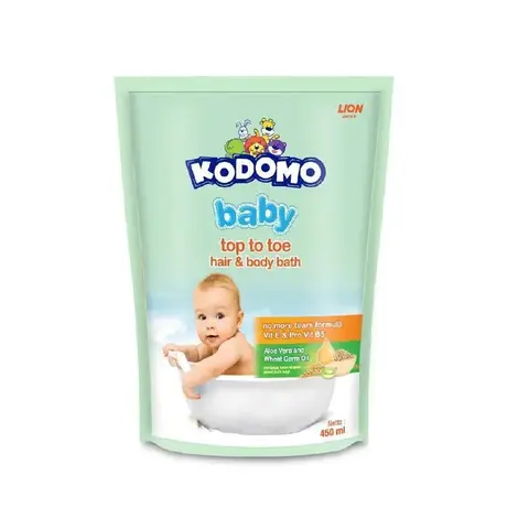 Kodomo Top to Toe kemasan isi ulang 450ml, membersihkan dengan lembut dari ujung kepala hingga kaki bayi. Bodywash & shampoo bayi dalam kemasan yang praktis. Teruji secara klinis lembut untuk kulit bayi.