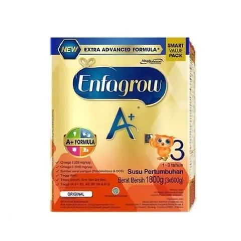Enfagrow A+3 adalah susu formula / susu anak usia 1-3 tahun. Mengandung banyak nutrisi penting untuk optimalkan pertumbuhan dan perkembangan si kecil karena di 3 tahun pertama kehidupan si kecil, otak tumbuh dan berkembang pesat. Manfaat Susu Formula/Susu Anak Enfagrow A+3 : - Omega 3 dan Omega 6 tertinggi untuk mendukung perkembangan otak si kecil. - Beta Glucan untuk meningkatkan daya tahan tubuh si kecil agar pembelajaran si kecil lebih baik. - MFGM Pro untuk mendukung kemampuan kognitif, kominikasi dan motorik kasar - Dengan kadar DHA tertingi untuk nutrisi perkembangan otak. Kandungan Nutrisi Susu Formula/Susu Anak Enfagrow A+3 : - DHA : Diperlukan untuk optimalkan perkembangan otak si kecil dimasa awal kehidupannya. - Kalsium : Berperan untuk pembentukan tulang dan gigi si kecil. - Protein : Bantu membangun dan memperbaiki jaringan tubuh. - Vitamin C : Berfungsi dalam pembentukan dan pemeliharaan jaringan kolagen. - Zat Besi : Merupakan salah satu komponen haemoglobin dalam sel darah merah yang akan membawa oksigen ke seluruh tubuh - Vitamin A : Mejaga kesehatan bagian permukaan mata, saluran pencernaan, saluran pernapasan dan kulit si kecil - Vitamin B6 : Berfungsi untuk kordinasi proses energi, sistem metabolisme dan pembentukan jaringan. - Vitamin B12 : Berperan sebagai koenzim dalam pembentukan asam nukleat seperti pembentukan sel darah merah Petunjuk Umum Pemakaian Susu Formula/Susu Anak Enfagrow A+3 : Dianjurkan untuk minum 3 gelas Enfagrow A+ 3 setiap hari untuk membantu memenuhi kebutuhan nutrisi anak dan keluarga. Petunjuk Penyiapan Susu Formula/Susu Anak Enfagrow A+3 : - Pastikan semua peralatan telah dicuci bersih sebelum digunakan. - Gunakan sendok takar dalam kemasan untuk menakar bubuk susu. Simpan sendok takar KERING dalam kemasan. - Masukkan 4 sendok takar (+- 40 gr) bubuk Enfagrow A+ 3 ke dalam 200 ml air hangat yang telah dididihkan selama 5 menit, untuk menghasilkan 230 ml larutan susu. - Aduk sampai rata. Habiskan dalam waktu 1 jam dan buang sisanya Petunjuk Penyimpanan Susu Formula/Susu Anak Enfagrow A+3 : - Simpan pada suhu ruang, Setelah dibuka, lipat kemasan aluminium foil dan masukkan ke dalam wadah bersih, kering dan tertutup rapat. - Habiskan isinya dalam waktu sebulan setelah kemasan dibuka. Jangan simpan bubuk susu dalam keadaan beku dan hindari paparan terhadap panas yang berlebihan. Perhatian: - Tidak cocok untuk bayi - Jangan digunakan bila terjadi kerusakan pada kemasan termasuk kerusakan pada aluminium foil. - Jika tidak diminum langsung, simpanlah Enfagrow A+ 3 yang telah disiap dalam lemari es dan diminum dalam waktu 24 jam. Komposisi: Susu bubuk (full cream dan skim), buttermilk bubuk, krimer nabati bubuk, sukrosa, sirup jagung padat, galaktooligosakarida (GOS), fruktosa, polidekstrosa (PDX), premiks mineral, asam dokosaheksaenoat (DHA) dari minyak ikan, perisa sintetik vanila, premiks vitamin, laktosa, beta-glucan, taurin. (mengandung antioksidan natrium askorbat, tokoferol dan askorbil palmitat) Shelf life: 24 bulan Diproduksi di Thailand HalalNo reviews found
