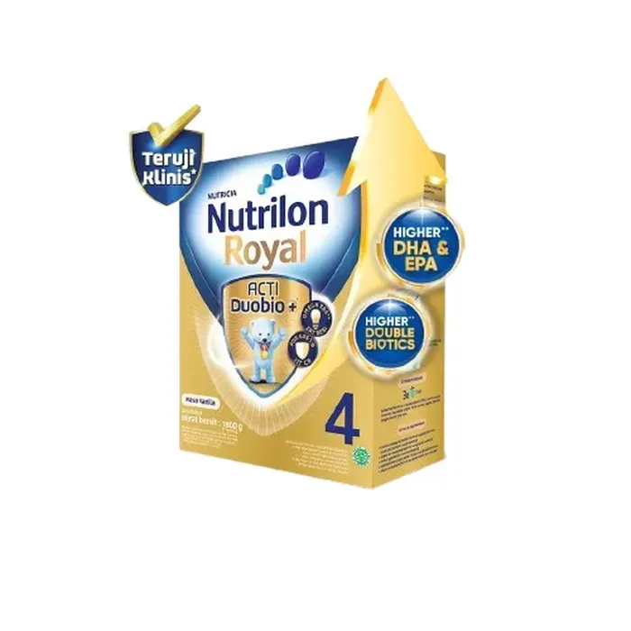 Nutrilon Royal 4 dengan Acti Duobio+ Kandungan Nutrilon Royal 4 dengan kebaikan Acti Duobio+ : Terbukti Klinis* bantu perkuat daya tahan tubuh si Kecil Nutrilon Royal 4: Satu-satunya formula dengan kombinasi FOS:GOS 1:9, EPA, DHA yang teruji klinis OMEGA LEBIH TINGGI : dukung kemampuan berpikir Omega 3 (Asam -Linolenat) 103 mg/saji. Omega 6 (Asam Linoleat) 1274 mg/saji. 0 GULA SUKROSA : tanpa gula tambahan Vitamin C & E, Vitamin C membantu dalam pembentukan dan pemeliharaan jaringan kolagen. Vitamin C membantu penyerapan zat besi. Zat Besi Zat besi merupakan komponen hemoglobin di dalam sel darah merah yang membawa oksigen ke seluruh bagian tubuh. Dukung tumbuh kembang anak dan perkembangan anak dengan nutrisi yang tepat. Kandungan susu dapat dilihat pada Informasi Nilai Gizi.