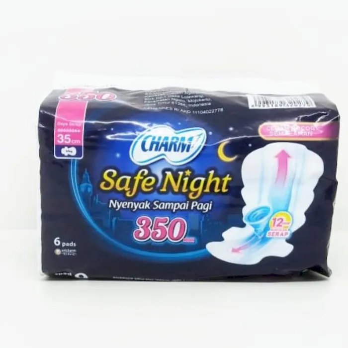 Charm safe night butterfly wing. Memberimu perlindungan segala sisi anti bocor meski berguling saat tidur, nyenyak sampai pagi. Fleksibel dan lebar di bagian belakang mengikuti bagaimanapun gerak tidurmu. KOMPOSISI : Pulp, sodium polyacrylate, nonwoven fabric, polyethylene film, paper tissue, hot melt adhesive. PERHATIAN : Jangan dibuang ke dalam toilet.No reviews found
