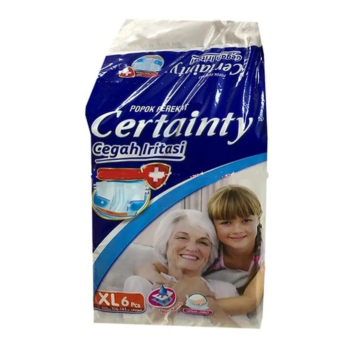 Certainty baru, popok dewasa tipe perekat yang dapat Cegah Iritasi, dengan Antibacterial dapat menghambat pertumbuhan bakteri. Daya serap cepat menjaga permukaan popok tetap kering. Selain itu permukaan popok sangat lembut sehingga nyaman menyentuh kulit. Dilengkapi dengan pelindung samping menjaga dari bocor samping. Size XL untuk ukuran pinggang 104-145cm. Petunjuk Penggunaan : Pemakaian pada posisi tidur: Letakan popok di bokong, posisikan di bagian tengah pinggul. Tariklah bagian depan popok keatas diantara kedua belah kaki. Lekatkan pelekatnya ke bagian zona pelekat depan. Sesuaikan pelekat pada kedua sisinya untuk mendapatkan kenyamanan pemakaian sesuai dengan bentuk tubuh.