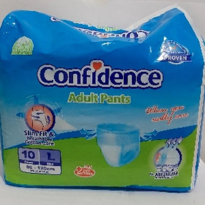 Merupakan popok celana untuk kondisi lansia aktif (inkontinensia) yang mudah digunakan. Bentuknya pas di badan, tidak menggelembung ketika dipakai dan serasa menggunakan celana dalam biasa. Confidence Adult Pants memiliki daya serap yang tinggi atau Extra Absorbency sehingga bisa dipakai lebih lama dan orang tua tidak perlu khawatir ketika tidak sempat mencari toilet. Dengan teknologi Side Leak Guard yang memiliki pelindung samping anti bocor sehingga tidak perlu khawatir terjadi kebocoran. Orang tua menjadi lebih Confidence untuk beraktivitas sehari-hari. Permukaan luarnya berbahan Clothlike selembut kain (bukan plastik) sehingga terasa sejuk saat digunakan, tidak panas dan membuat kulit nyaman serta tidak menyebabkan iritasi pada kulit.