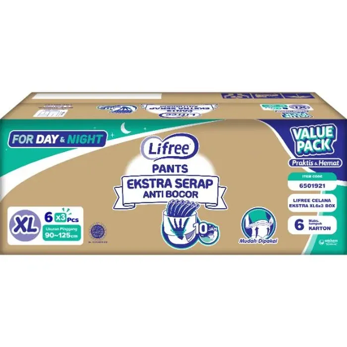 Popok celana ekstra serap urine 6 gelas, anti bocor hingga 10 jam, tahan lama dipakai baik siang maupun malam. Mudah dipakai sendiri oleh orang tua karena memiliki karet elastis di segala sisi, cocok bagi orang tua yang bisa berdiri dan berjalan dengan dibantu, sehingga tidak perlu khawatir saat tidak sempat mencapai toilet. Nyaman beraktivitas tanpa khawatir bocor. Ukuran pinggang: M: 60-85 cm L: 75-100 cm XL: 90-125 cm XXL: 100-140 cm Daya serap 6 gelasNo reviews found