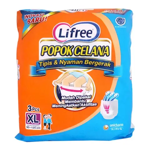 Lifree Popok celana merupakan popok yang memudahkan orang tua yang masih bisa berjalan sendiri dan beraktivitas normal seperti biasa dengan nyaman tanpa khawatir bocor. Lifree Popok celana terdiri dari berbagai ukuran, salah satunya ukuran XL dengan spesifikasi ukuran pinggang 90-125 cm. Dalam 1 kemasan Lifree Popok celana terdapat 3 buah popok celana yang siap pakai. Lifree Popok celana sangat mudah digunakan yaitu seperti menggunakan celana dalam saja. Selain itu, Lifree Popok celana juga mempunyai banyak keunggulan seperti bentuknya tipis sehingga memudahkan untuk bergerak seperti tidak sedang menggunakan popok, bahan selembut kain jadi nyaman dipakai, daya serap tinggi, ban pinggang elastis sehingga lebih mudah dipakai dibanding yang tipe perekat, terdapat pelindung samping untuk mencegah bocor samping, serta cara melepaskannya pun mudah yaitu cukup dengan merobek bagian samping popok. Kegunaan : Popok celana bagi orang tua yang masih bisa berdiri dan berjalan sendiri
