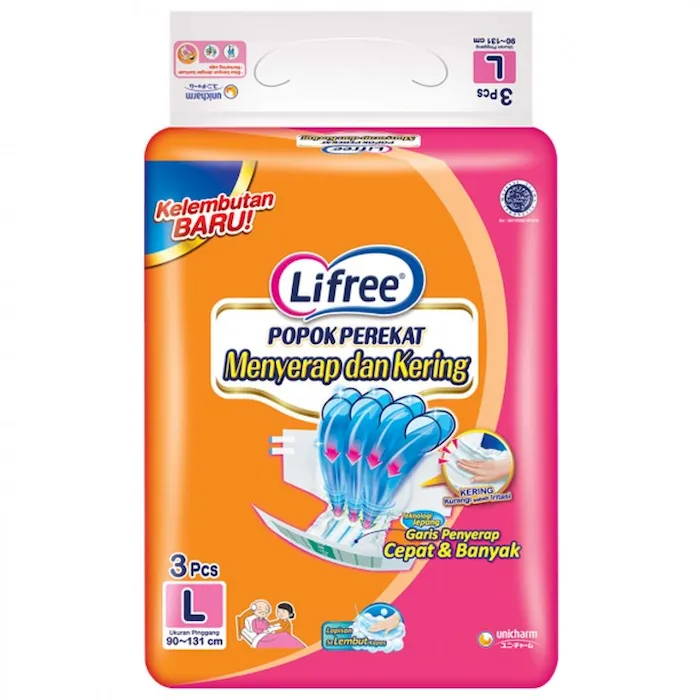 Lifree popok perekat menyerap dan kering yang dapat direkat berulang kali. Cara Penggunaan : 1.Gulingkan badan ke samping, letakkan popok dengan posisi tulang ekor di bagian tengah, lalu lekuklah tepian popok agar perekat tidak mengenai kulit. 2. Letakkan popok di tengah-tengah badan, lalu tarik dan rapatkan popok agar tidak ada celah di pangkal paha. 3. Taruhlah ujung popok di tengah perut, lalu rekatkan pita perekatnya. 4. Pelapis bagian paha harus ada di bagian luar. Cara Penyimpanan : Simpanlah di tempat yang sejuk dan kering. Komposisi : Pulp, polymer, tissue, nonwoven fabrics, hot melt adhesive.No reviews found