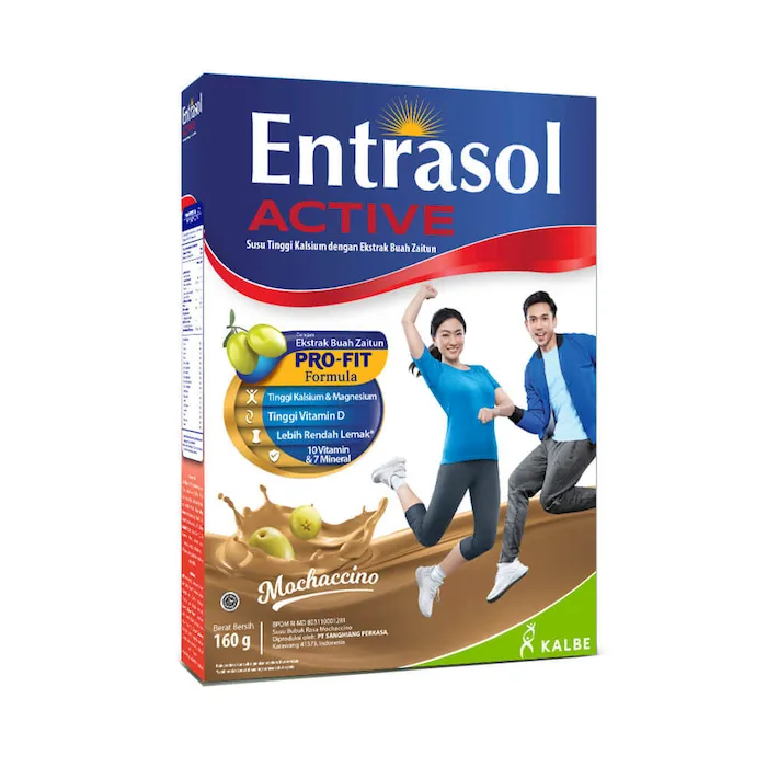 Entrasol Active adalah Nutrisi Tinggi Kalsium dengan Ekstrak Buah Zaitun dilengkapi dengan Pro-Fit Formula (Tinggi Kalsium & Magnesium, Tinggi Vitamin D, Lebih Rendah Lemak, 10 Vitamin & 7 Mineral) untuk membantu penuhi nutrisi harian agar tetap aktif dan produktif.
