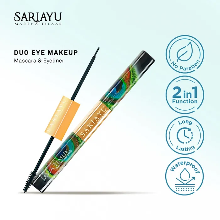 Inovasi baru Sariayu, Mascara dan Eyeliner dalam satu kemasan praktis. Mascara dan eyeliner cair dalam 1 kemasan praktis untuk riasan mata yang lebih sempurna. Formula waterproof yang tahan lama. Cara penggunaan: Mascara: Aplikasikan maskara pada bulu mata, mulai dari pangkal bulu mata Eyeliner: Aplikasikan eyeliner pada garis kelopak mata