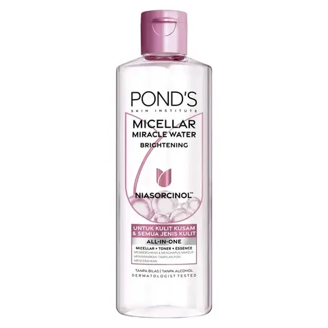 POND'S Vitamin Micellar Water Brightening Rose dilengkapi dengan kandungan yang membuat wajah Anda segar dan glowing setiap hari. Vitamin C di dalamnya membantu mencerahkan wajah dan mengurangi kemerahan dalam satu kali usap. Produk ini diformulasikan khusus sehingga cocok digunakan untuk semua jenis kulit. Cara pemakaiannya pun mudah, cukup tuangkan micellar water pada kapas secukupnya, kemudian usap kapas ke seluruh permukaan wajah. Terakhir, tarik kapas dan ulangi di bagian wajah yang ingin dibersihkan, dan wajah Anda akan kembali bersinar. Tersedia dalam kemasan 55ml dan 100ml, produk ini siap menjadi bagian dari rutinitas perawatan kulit Anda. Jadi, tunggu apa lagi? Mulailah rutinitas perawatan kulit Anda dengan POND'S Vitamin Micellar Water Brightening Rose dan rasakan perbedaannya sekarang juga! Hasil : Dapatkan hasil kulit yang bersih dan cerah untuk wajah yang Pinkish Bright Glow. Cara pakai: Tuangkan Pond’s Vitamin Micellar Water (Makeup Remover) ke kapas dan usapkan ke kulit untuk membersihkan makeup dan kotoran Tidak perlu dibilas Untuk semua jenis kulit Telah diuji oleh dokter mata dan kulit