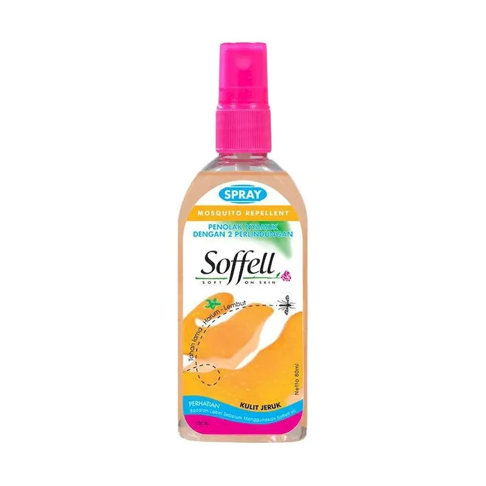 Soffell melindungi tubuh dari gigitan nyamuk dengan efektifitas perlindungan mencapai 8 jam SOFFELL mengandung pelembab/ moisturizer khusus, sehingga saat digunakan kulit tetap lembut, tidak panas, dan tidak lengketNo reviews found